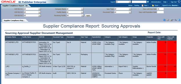 Interactive table displaying detailed information about supplier documentation including Company Name, Facility Name, SCRM Company BU, Document Type, Description, Originator, Days until Due and Days until Expired. |