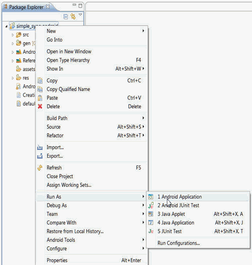 Run/Debug the simple_sync_android on a device emulator. After a successful build, to run the application, right click on the “simple_sync_android” project. Go to “Run As” item, and select “Android Application.” This will bring up the Android Emulator, where you should find “Mobile Sync” application.