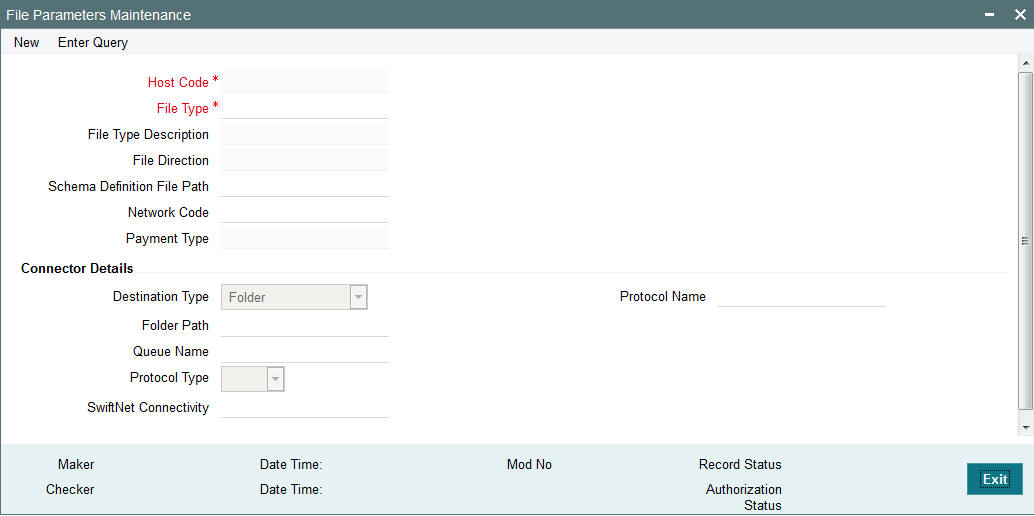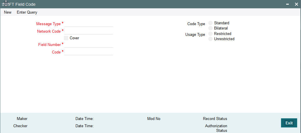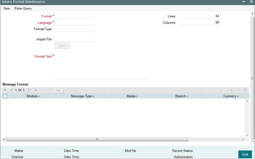 In Advice Format Maintenance screen you can find a pre-shipped record for Format type ‘SWIFT’. You can invoke the ‘Advice Format Maintenance’ screen by typing ‘PMDSNCKM’ in the field at the top right corner of the application toolbar and clicking the adjoining arrow button.Click new button on the Application toolbar.