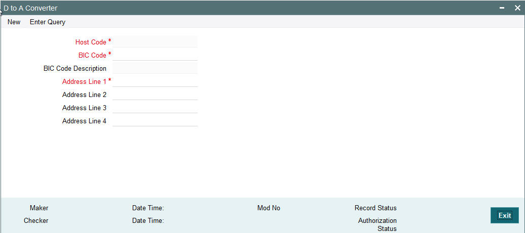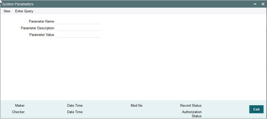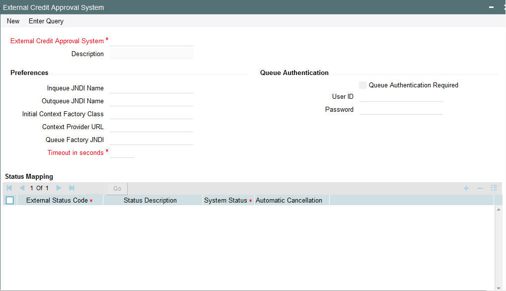You can maintain the external system details from which credit approval for debit entries has to be obtained in the ‘External Credit Approval System’ screen. You can invoke the ‘External Credit Approval System’ screen by typing ‘PMDECAMT’ in the field at the top right corner of the application toolbar and clicking the adjoining arrow button.Click new button on the Application toolbar.
