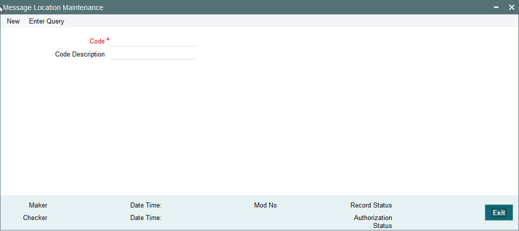 You can maintain the message locations in this screen. You can invoke the ‘Message Location Maintenance’ screen by typing ‘PMDLOCMN’ in the field at the top right corner of the application toolbar and clicking the adjoining arrow button. Click new button on the Application toolbar.