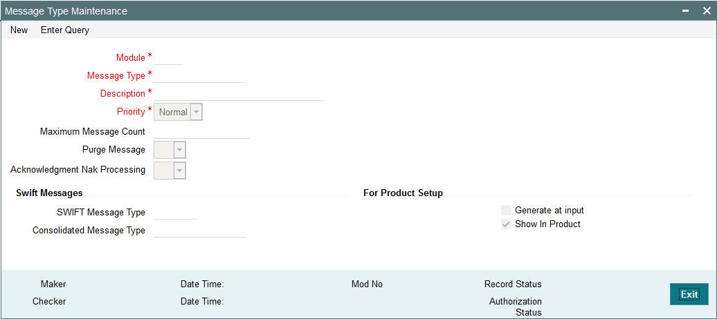 Message types are pre-shipped. You can view the message type detains in this screen. You can invoke the ‘Message Location Maintenance’ screen by typing ‘PMDMSTYM’ in the field at the top right corner of the application toolbar and clicking the adjoining arrow button. Click new button on the Application toolbar.