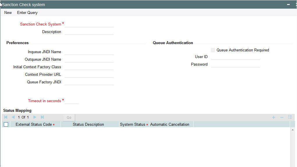 You can maintain the external system details to which the sanction request are to be sent with transaction party details in the ‘Sanction Check System’ screen. You can invoke the ‘Sanction Check System’ screen by typing ‘PMDSNCKM’ in the field at the top right corner of the application toolbar and clicking the adjoining arrow button.Click new button on the Application toolbar.
