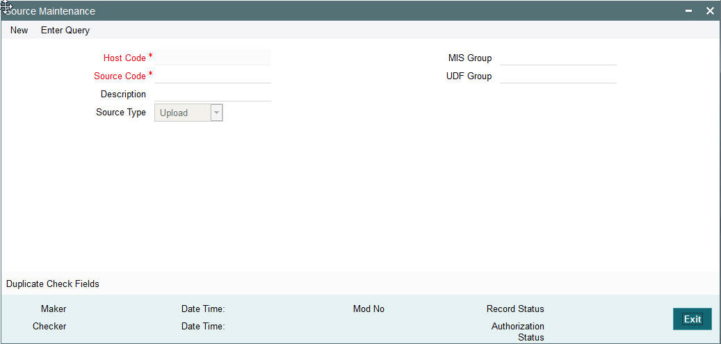 You can invoke the ‘Source Maintenance’ screen by typing ‘PMDSORCE’ in the field at the top right corner of the application toolbar and clicking the adjoining arrow button.Click new button on the Application toolbar.