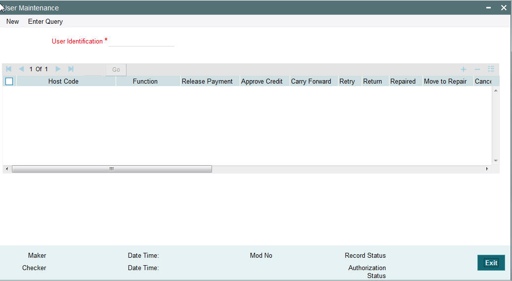 You can invoke the ‘User Maintenance’ screen by typing ‘PMDUSRDF’ in the field at the top right corner of the application toolbar and clicking the adjoining arrow button.Click new button on the Application toolbar.