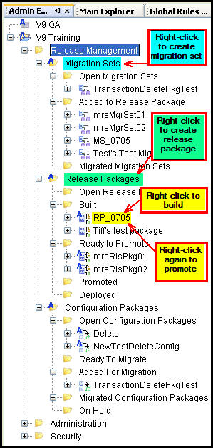After a configuration package is marked Ready to Migrate, the package is moved to the Migration Sets folder in Release Management, which is located on the Admin Explorer tab. The Build Manager (or BA with administrative privileges) will create a migration set that includes the configuration package as well as any other packages that are relevant.