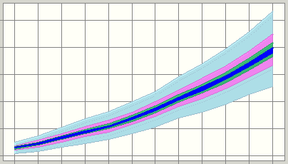 您可以使用趨勢圖「檢視」功能表,變更趨勢圖中確定性圖形帶的放置。預設設定會將圖形帶集中在每個預測的中位數。您可以變更圖形帶的位置,使其錨定於預測範圍的上端或下端。