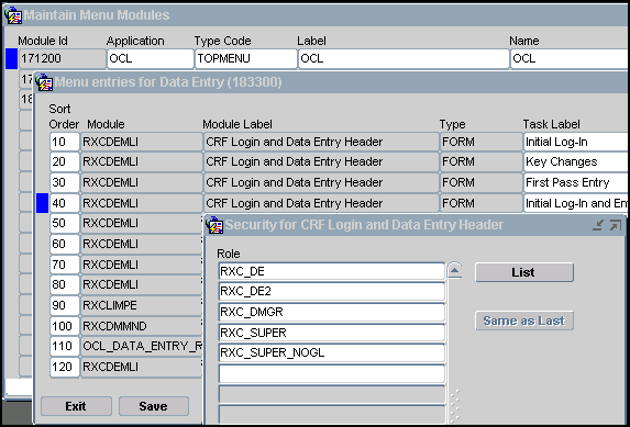 When Oracle-defined menu-role associations have not been modified, to see the Data Entry menu option of OCL your account must have one of these roles: RXC_DE; RXC_DE2; RXC_DMGR; RXC_SUPER; or RXC_SUPER_NOGL.