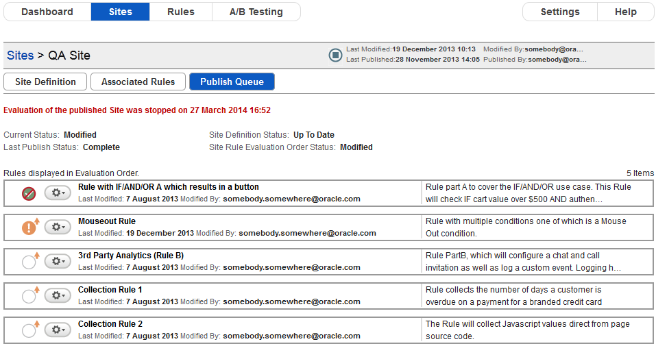 Another user has updated Rules & Sites during your session. This means that someone else logged onto Engagement Engine Editor has made changes to the highlighted Rule or Site during your session. Engagement Engine Editor always publishes the most recently saved version of any Rule, so publishing a Rule that has been edited by another user may produce unexpected results unless you know what changes were made.