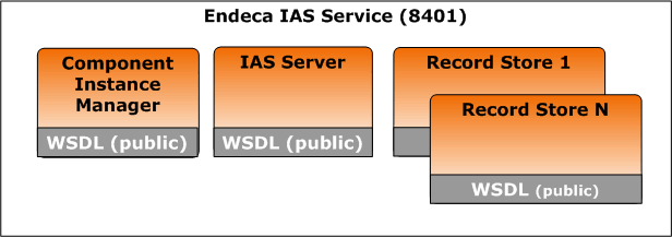 Endeca IAS Serviceは、IAS Server、Component Instance Managerおよび任意の数のレコード・ストア・インスタンス(クロールごとに1つ)を実行するサーブレット・コンテナです。