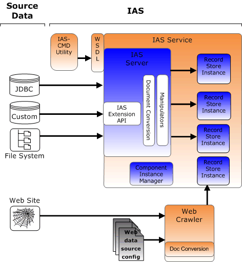 - Endeca IAS Serviceは、IAS Server、Component Instance Managerおよび任意の数のレコード・ストア・インスタンス(クロールごとに1つ)を実行するサーブレット・コンテナです。