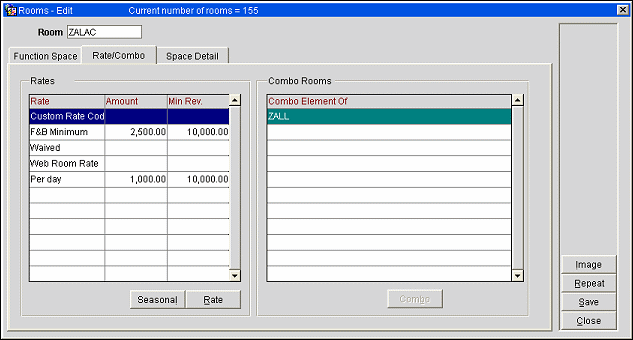 In SFA, you may also access the Rooms screen Rate/Combo tab by editing a function space from the Property Configuration screen Convention/Meeting Rooms tab (select Configuration>Property>Property Details to access the Property Configuration screen.)