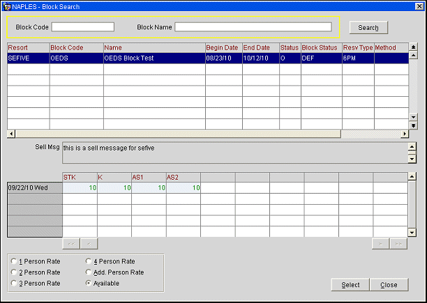 The Block Search screen appears when you select the down-arrow from the Block Code field on the Reservation screen main tab, when you select the down-arrow from the Block field on the Rate Query screen, or when you select the down arrow on the Block Code or Block Name fields on the ORS Sales Screen.