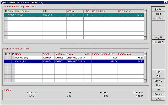 Note: If a travel agent or source is attached to a reservation in the commission payment process, the agent/source remains attached to the reservation until it is detached by using the Detach feature of the Commissions module, or until a different agent or source is attached to the reservation.