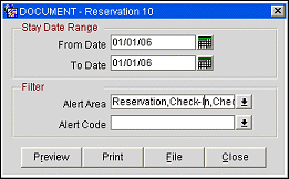 The Alerts report will display all reservations with an attached Alert that fall within the stay date range selected on the attached RES10.FMX. The Alert functionality is available when the RESERVATIONS > ALERTS application function is set to Y.