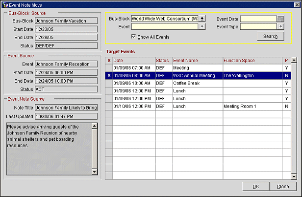 Use the search criteria to find the business block which includes the event to which you wish to move the note. An event note may be moved to only one event. When you select the Search button, events matching your search options appear in the Target Events grid.