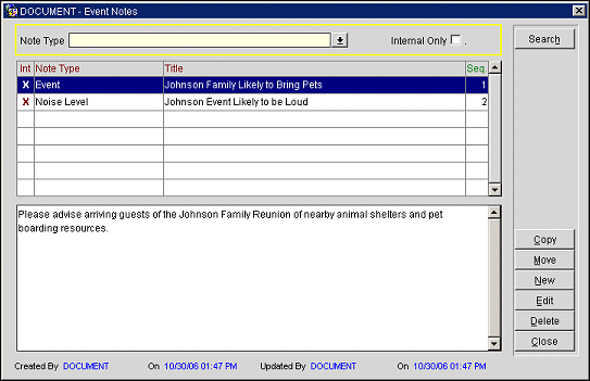 Move. Remove the highlighted note from the current Event and attach it to one or more other events. The Event Note Move screen appears.