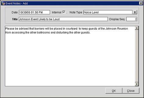 Note Type. Select the down arrow to choose a note type. Note types are configured in System Configuration>Setup>Note Types. Some typical Event Note types would be, Noise Level, Change, Event and Alternate Space.