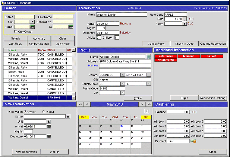 The Cashiering section displays a window-by-window breakdown and the total amount of charges for the reservation for a quick reference.