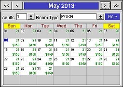 The availability calendar shows rate and availability information, as appropriate, for the current month. The buttons may be used to change the display for a different month and/or year: