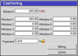 Windows 1 - Windows 8. Windows 1 - 8 fields are view only and display the total amount that has been posted to each of them respectively. These windows and their postings would be visible within the Billing screen and their totals are included in the Balance field above Window 1.