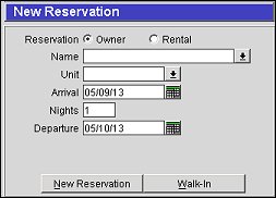 To create a new reservation for an owner, select the Owner radio button, enter all or part of the owner's name in the Name field, and select the New Reservation button to access the Reservation screen and complete the reservation. To create a new rental/no-owner reservation, select the Rental radio button and the select the New Reservation button to access the Reservation screen and complete the reservation.