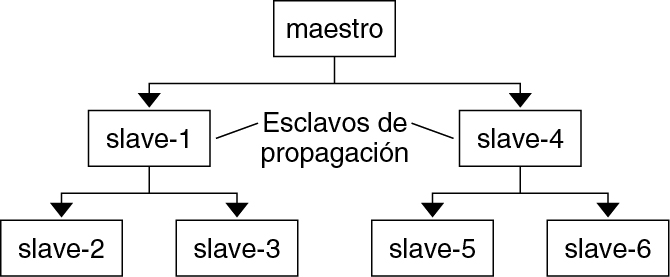 Por ejemplo, suponga que su sitio tiene un KDC maestro y seis KDC esclavos (que se muestran en la Figure 4–2), donde del slave-1 al slave-3 constan de una agrupación lógica y del slave-4 al slave-6 constan de otra agrupación lógica. Para configurar la propagación en paralelo, puede hacer que el KDC maestro propague la base de datos al slave-1 y slave-4. A su vez, los KDC esclavos pueden propagar la base de datos a los KDC esclavos de su grupo.