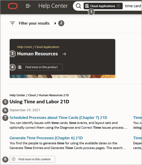 Oracle Help Centerのグローバル・ヘッダーでの検索の範囲は、アクセスしているページによって異なります。たとえば、「Oracle Fusion Cloud Applications Suite」ページでは、Fusion Applicationsのすべてのガイドを対象に検索されます。特定のクラウド・サービスのページでは、そのサービス内でのみ検索され、より的を絞った結果が表示されます。1つのガイド内を検索する場合は、ガイドの「Search」タブを使用します。