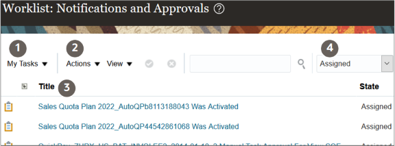 「ワークリスト: 通知および承認」リージョンは、「ワークリスト: 通知および承認」作業領域を使用する場合と同じ方法で使用しますが、ここでは割当済ステータスのタスクのみを表示できます。