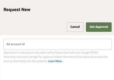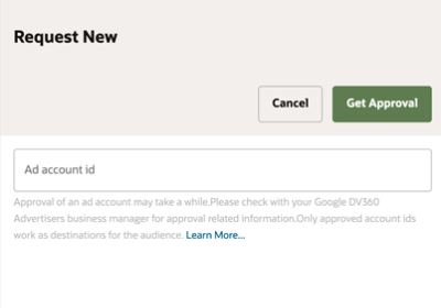 重要: 広告アカウントに対するUnityアクセスを要求する前に、Googleアド・マネージャでカスタマ・マッチ・アップロード・パートナとしてOracleを承認し、広告アカウントをOracleと共有する必要があります。この共有を有効にしていない場合は、Oracle UnityがDOES_NOT_EXISTエラーを返します。
