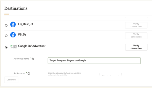 ノート: 最大1時間かかるFacebookの広告アカウントの承認とは異なり、広告アカウントをOracleと共有している場合は、Google広告アカウントの承認が即座に実行されます。広告アカウントをOracleと共有していないと、「アカウントの追加」の承認要求が失敗します。