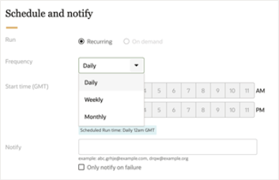 定期的なキャンペーン・ジョブについては、実行する「頻度」、「開始時間」および「日」を選択します。「毎時」の頻度はGoogleに対するオプションではなく、無効になっていることに注意してください。