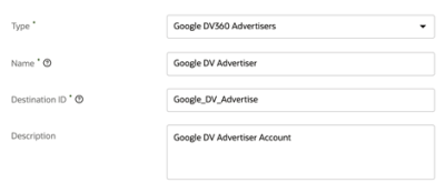 ジョブ詳細セクションでは、宛先のタイプおよびOracle Unityでの表示方法を定義できます。ドロップダウン・リストを使用して、「Google Ads」、「Google DV360広告主」、「Google DV360パートナ」のいずれかを選択します。