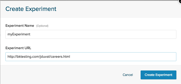 - 最適化するWebページの名前およびURLを入力し、「Create Experiment」をクリックします。