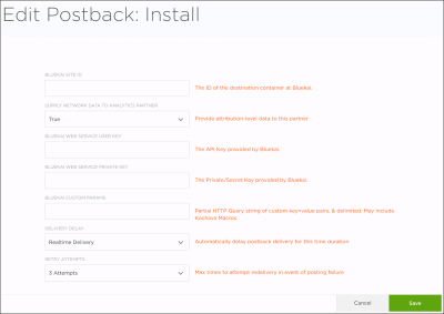 Kochavaのポストバック方式を使用して、モバイルのインストールおよびアプリ内イベントのリアルタイムのフィードをプラットフォームに送信できます。