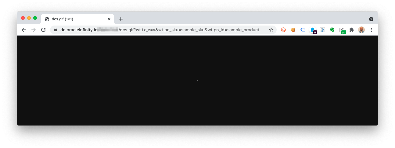 https://dc.oracleinfinity.io/{ENTERACCOUNTGUID}/dcs.gif?wt.event=product_view&wt.product_sku=sample_sku&wt.pn_id=sample_product_id&wt.es=sample_url&wt.product_price=14.99&wt.customer_id=sample_customer_id&wt.product_category=sample_category&wt.product_name=sample_product_name&wt.a_nm=sample_app_name&wt.av=sample_app_version&mi_ecmp=sample_campaign_name&mi_u=sample_mi_id&wt.co_f=sample_anonymous_id - ブラウザでサンプル・リクエストを起動します。