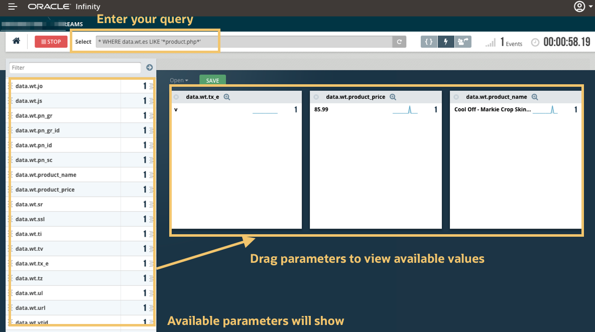 ストリームを使用して、Infinityアカウントにある使用可能なデータを表示できます。たとえば、提案されたストリーム問合せテンプレートを使用して、イベントごとに使用可能なデータを検証できます。または、使用可能なすべてのフィールドを表示する独自の問合せを実行することもできます。たとえば、製品ページに