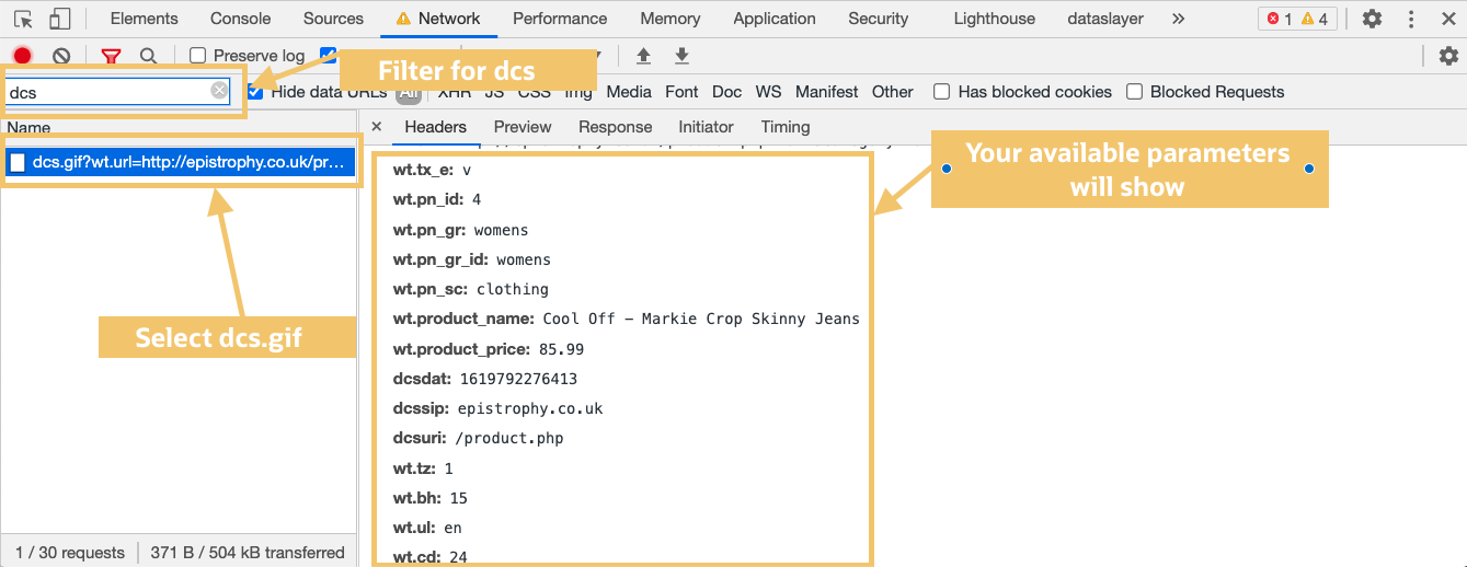 dcs.gifリクエストを表示して、イベントごとに使用可能なパラメータを表示できます。