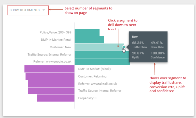 - 任意のセグメントにマウスを置くと、そのセグメントの統計が表示されます。これには、すべての訪問者のコンバージョン率、トラフィックの割合および各セグメントのアップリフトが含まれます。