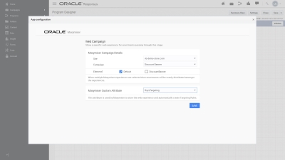 Webサイトで一貫したエクスペリエンスを提供するために、ResponsysではMaxymiser Webキャンペーン・アプリを使用します。アプリは、Responsys管理ユーザーによってインストールされる必要があり、次のリンクを使用してインストールできます。