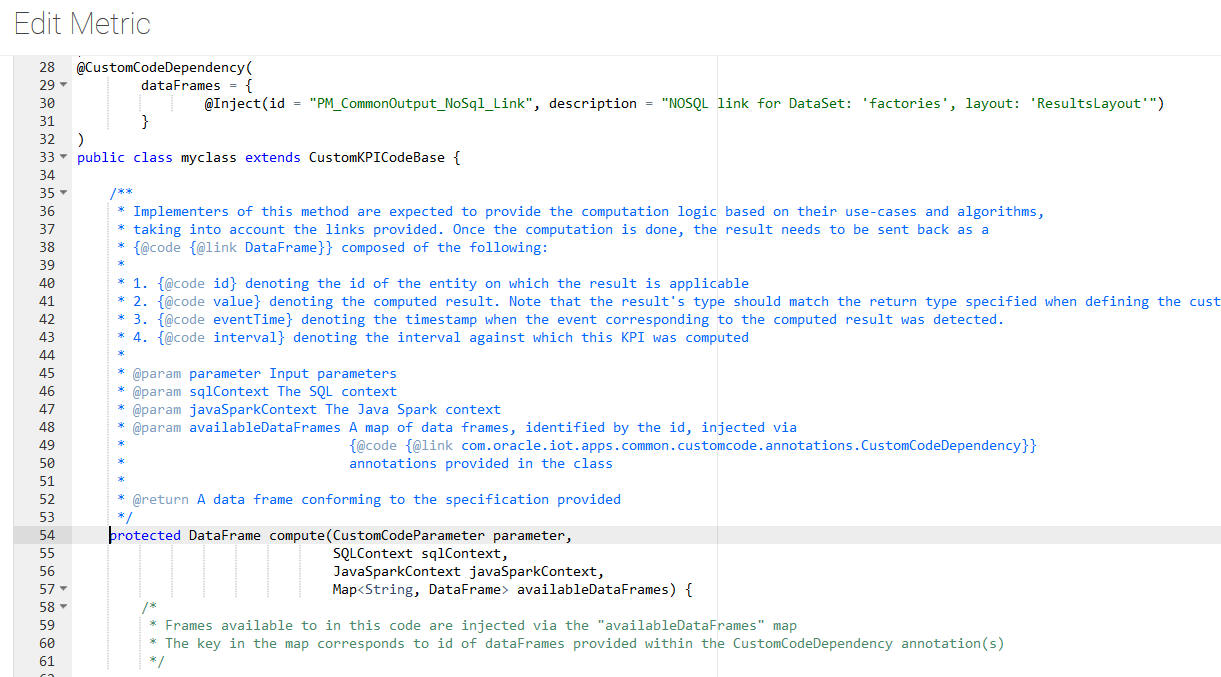 一般的な分析アナリティクス・サービスで提供される一連の式では対応できない計算が必要なドメイン固有メトリックには、カスタム・コード・メトリックを使用します。カスタム・コード・メトリックは、Sparkでのコードの記述や管理の知識のある、アナリストやシステム・インテグレータなどの上級ユーザーを対象としています。カスタム・メトリックは、コードのスキャフォールディング機能や、コード構築のために編集して使用できるテンプレートを備えています。
