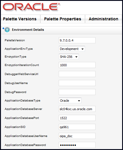 Log in to the Web Application Utility using the following URL: http://host:port/PaletteConfig/. The host (server name) and port should be the same as the host and port of the application (OICE or OINBU) being used. The default user name and password are provided in the Web Application Utility installation guide.