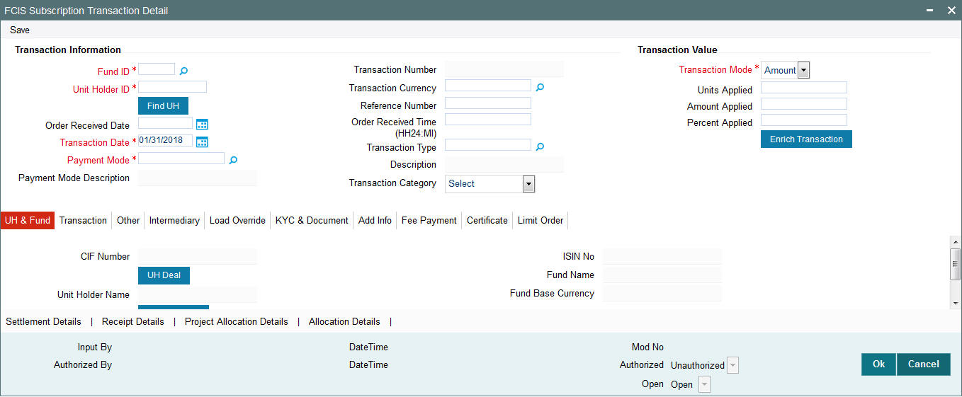 The dividend due for a UT investment will be reinvested with the Reference Type RE and Reference Number ‘REINV’. This is shown in the screen given below: