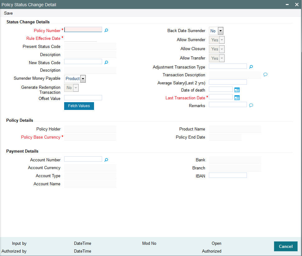 When you enter the Policy Number, the existing status of the Policy will be displayed. You will not be allowed to change this field.