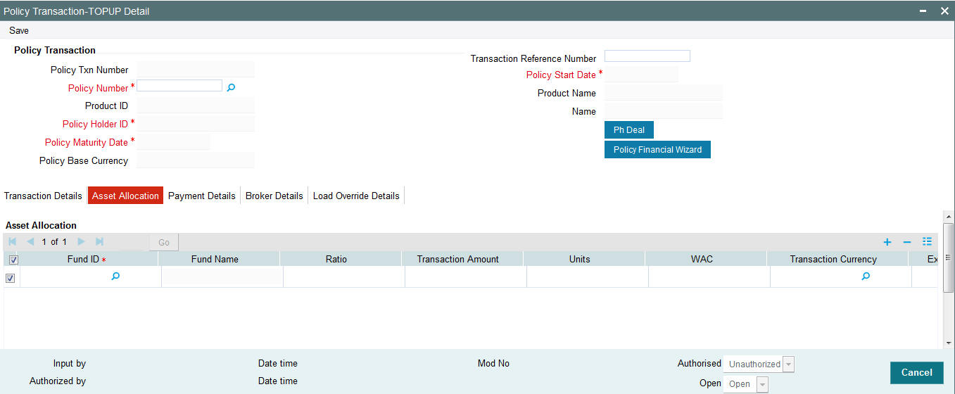 When you click ‘Policy Financial Wizard’ button in the Policy Transaction-TOPUP Detail screen, the following screen in invoked: