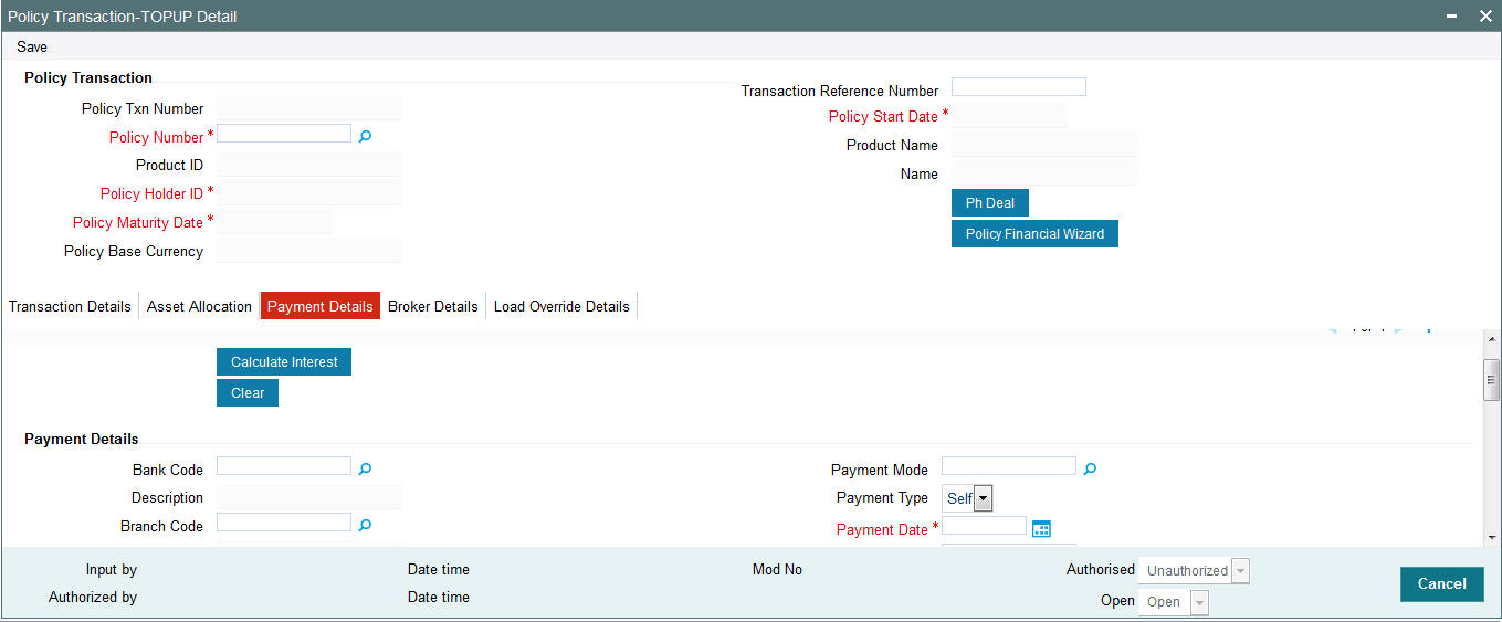 Capture the details of payments made by the Policy Holder towards processing of the transaction in this tab.