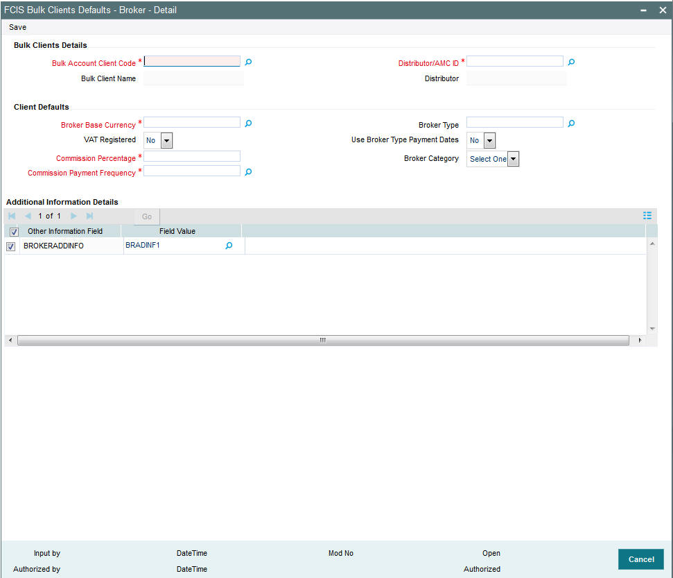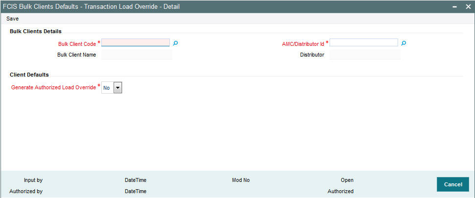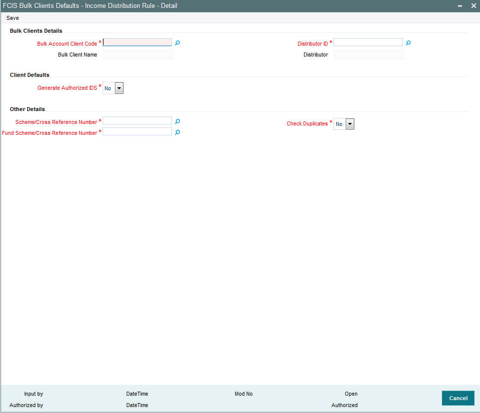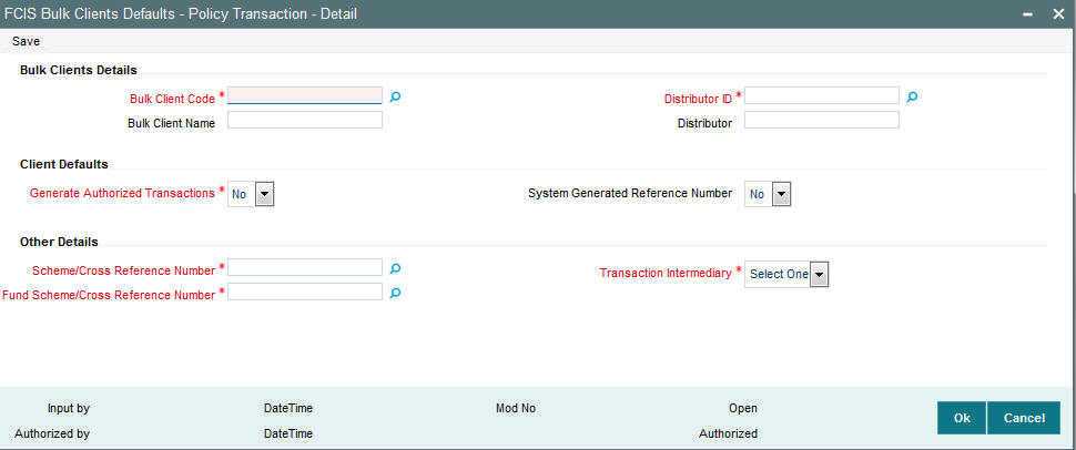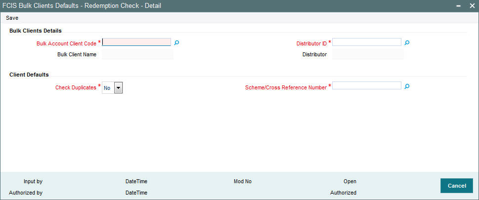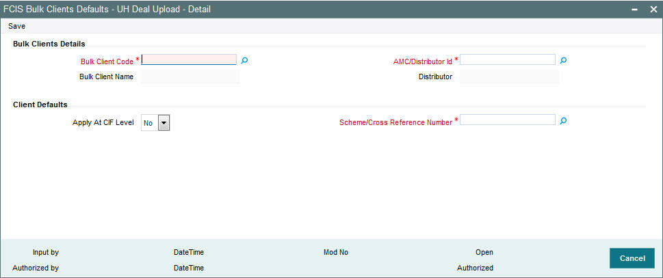 You can invoke this screen by clicking the Detail option under the Bulk Client Defaults menu in the Browser. Click new icon to enter the details.