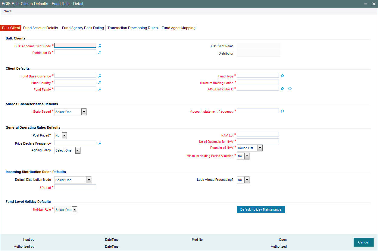 For some of the upload types, the default information consists of fields from the corresponding maintenance in the system; therefore, the default information is very similar to a maintenance template or blueprint. For instance, when you define the defaults for fund rules import, you specify all the fund rules in the Bulk Clients Defaults screen. This is just like filling in the fund rules in the system for a new fund; validations for all fields are similar to those made in the Fund Rules screens when a new fund is entered.