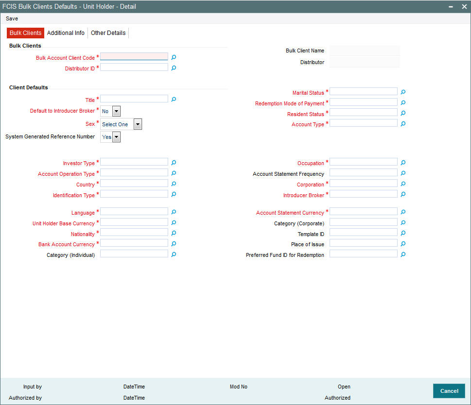 Accordingly, you must select the ID of the bulk client for whom the default information is applicable, in the Bulk Account Client Code field, and the AMC / distributor entity in the AMC / Distributor ID field.