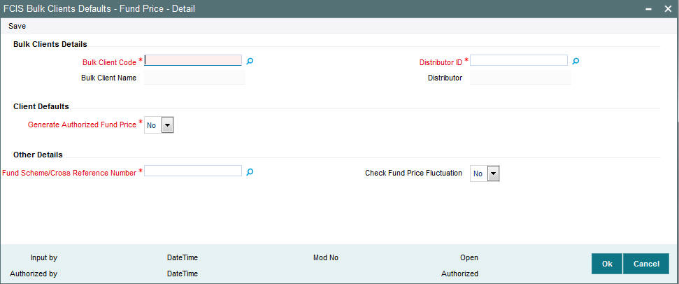 You can invoke the FCIS Bulk Clients Defaults (Fund Price) Detail screen by typing ‘UTDCDFP’ in the field at the top right corner of the Application tool bar and clicking on the adjoining arrow button.